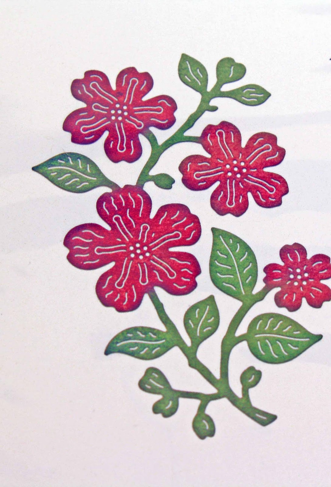 The flowers and leaves/ ferns were die cut using the f"loral bouquet kit" In the centers of the flowers I used gala glitz in pink. On the shite sprays I placed some white flower soft. Kind of looks like q-tips! lol